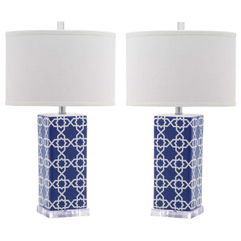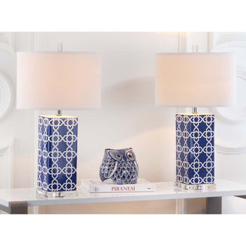Bring a burst of color and pattern into neutrally styled rooms with the Quatrefoil Table Lamp (set of two). Crafted of navy and white ceramic with an acrylic base and silver neck, this Moroccan patterned design is topped with a contemporary white cotton shade.
