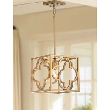 Bring glamour and sophistication to your Decor with this contemporary trellis pendant. Designed with a bold metal frame, it features a decadent gold finish and quatrefoil cut out that makes a grand statement in any foyer, living room or dining room.