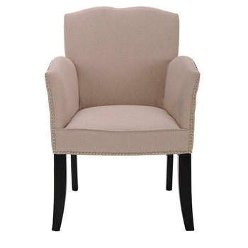 The Rachel Arm Chair is a throne fit for a queen. Fully upholstered in taupe linen with slightly curved arms and backrest with a flowing wave like silhouette, Rachel's silver nail heads exude subtle yet royal glamour. Tapered wood legs in a chic black finish give Rachel a touch of additional decorative drama.