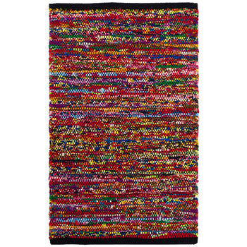 The bold black base of the rug is cleverly accented with vibrant red streaks, giving it an energetic presence that is sure to add vibrancy to any space. The eclectic pattern seen in the image, characterized by its multicolored specs and bursts of color spectrum threading through the black backdrop, represents the rug's striking appearance that is bound to be a conversation starter.