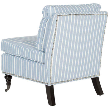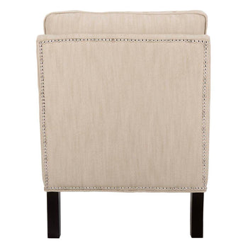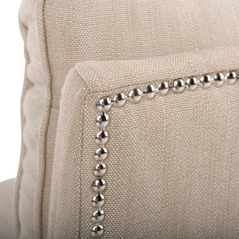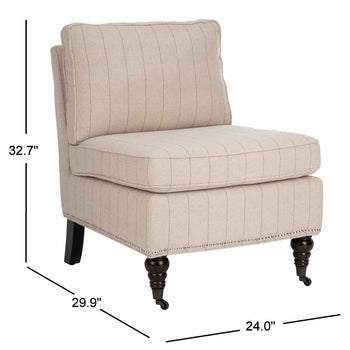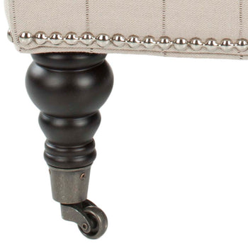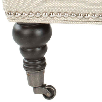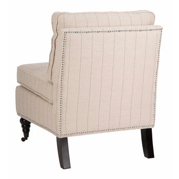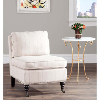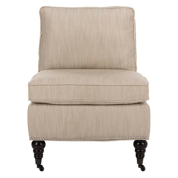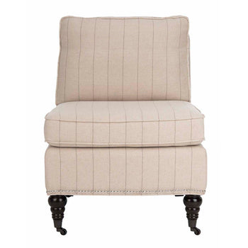 Low slung with clean lines, the easy going Randy Slipper Chair is effortlessly versatile in plush off white linen, perfectly providing comfortable lounging. Spindle birch wood legs in an espresso finish and chic nailhead trim dramatically highlight Randy's laidback silhouette.