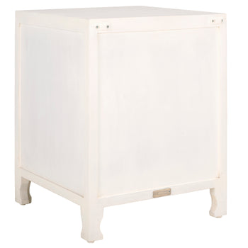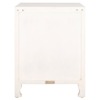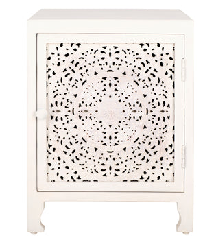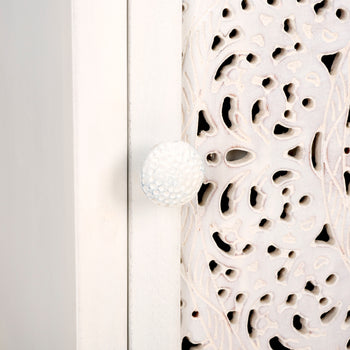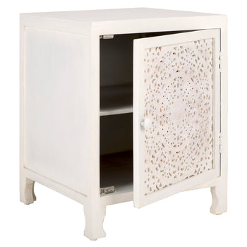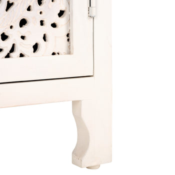Add an artistic flair to your bedside with the Raura nightstand. Carved from Mango wood, our side table remains beautifully detailed. It combines vegetal patterns within a bold and eye-catching geometry. The striking piece is completed with subtly curved legs and a white wash finish to attain a graceful vintage look. Behind the artisanal facade hides two roomy shelves to keep all your nighttime essentials within easy reach.