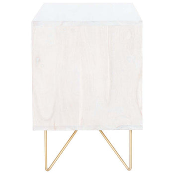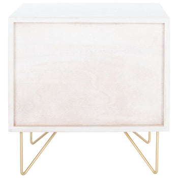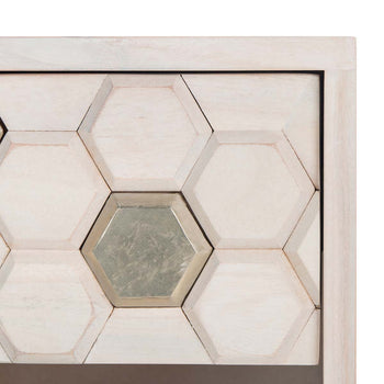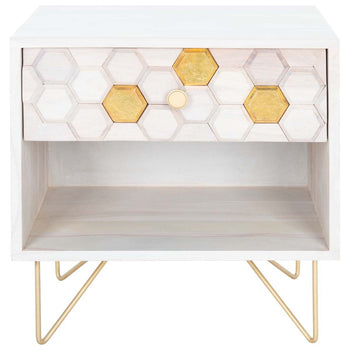 Transform any bedroom into a luxurious retreat with this contemporary Raveena Nightstand. Raveena's carved honeycomb pattern makes a bold style statement with shining silver accents that beautifully pair with its matching hairpin legs, while an open shelf provides plentiful storage with airy appeal.
