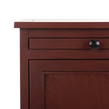 This Raven Storage Unit is a stylish storage solution in any classic contemporary or farmhouse?Decor. A two shelf cabinet in a dark cherry finish and woven basket provide ample space for stashing away life's miscellany, and a pull out writing surface makes Raven perfect for writing last minute notes in the entryway.