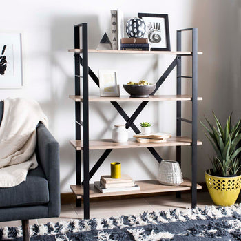 A modern classic, this Mid Century Raylan 4 tier Etag?re is a designer favorite. Crafted with oak and black iron, its four generous shelves bring retro style, substantial storage, and a myriad of display options to the living room or study.