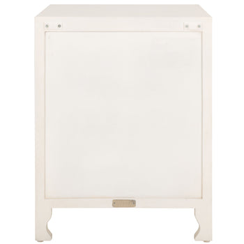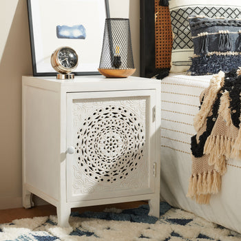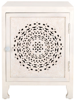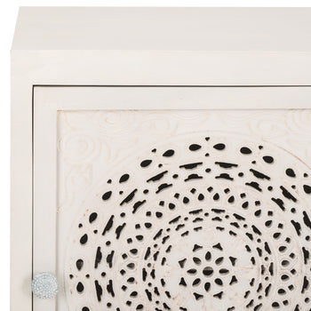Make a bold and eclectic statement with the Regius nightstand. Mango wood is beautifully cut out to deliver an artistic and eye-catching pattern. Our eclectic side table features a Mandela design to serve as an optical delight for your bedroom. It is completed with subtly curved legs and round handles to add a touch of grace and elegance. With a classy white wash finish, our artistic facade opens to reveal two roomy shelves, perfect for storing and organizing all your nighttime essentials.
