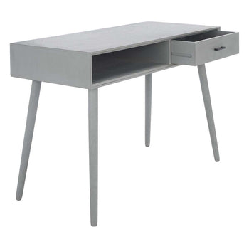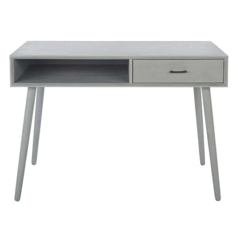 This Remy Writing Desk upgrades any office with a hint of Mid Century charm. Remy's splayed legs provide a subtle sense of depth and motion that revitalizes workspace Decor, and its open shelf and single drawer are perfect for storing your 9 to 5 essentials. A distressed grey finish completes the look.