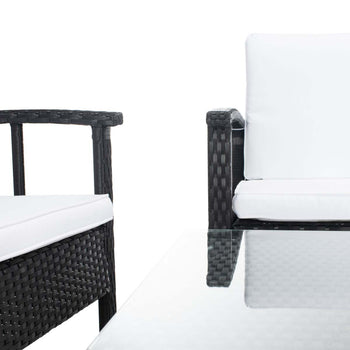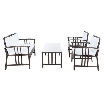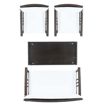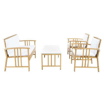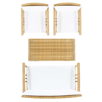 Bring the relaxation of a breezy island shore to your private outdoor oasis with this Reslor 4 Piece Living Set. Woven brown wicker frames emanate a coastal cool ambiance, pairing beautifully with plush white cushions for long hours soaking up the sun. Includes two armchairs, one loveseat, and a glass topped coffee table.