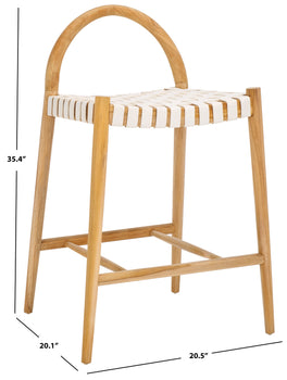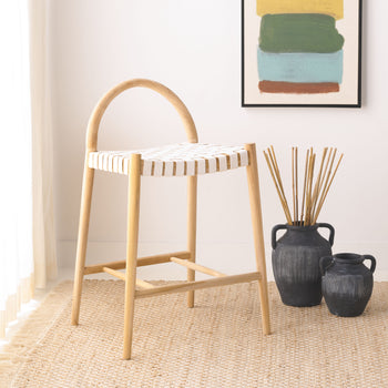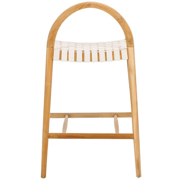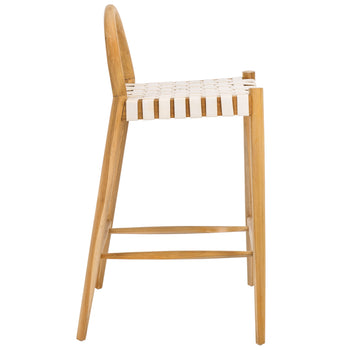Invite chic style and effortless comfort to your causal meals with our Rhyan counter stool. Showcasing elevated details and a stunning blend of materials, our counter stool offers eye-catching style and comfort. It features a woven white leather seat for a chic and modern touch. The airy weave beautifully complements the refined sungkai wood frame to offer minimalist warmth. A sparse arched back adds an eye-catching impact to our stool. Ready to become a chic and stylish focal point, our counter stool offers easy comfort to your kitchen counters and high dining areas.