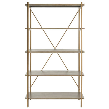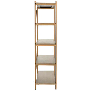 Filled with character and charm, this modern 5 tier ?tag?re was designed to exhibit any curated collection of fine objects. Crafted with a warm rustic oak finish, its gold metal frame adds a luxuriant touch to any living room, dining room or home office.