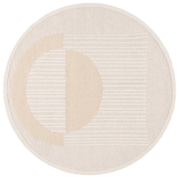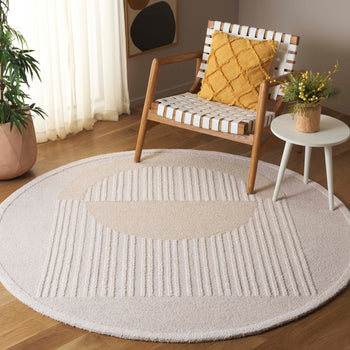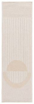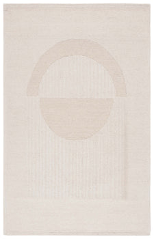 The area rug features a captivating pattern with an arch motif that blends geometric simplicity with organic curves, giving it a modern touch that complements any decor style. The beautifully contrasting beige tones against the ivory base create a textured effect, resulting in a piece that's not only visually appealing but also tactilely engaging.