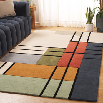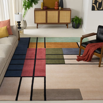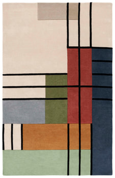 The design, reminiscent of abstract expressionism, exhibits a harmonious interplay of geometric lines and blocks, creating an engaging visual landscape. Dark outlines segment the ivory base into an array of complementary blocks featuring sophisticated shades of green, accented with touches of blue, red, and neutral tones. This timeless piece is designed to be a captivating focal point, while simultaneously blending seamlessly with a variety of interior decor styles.