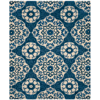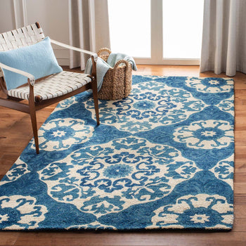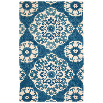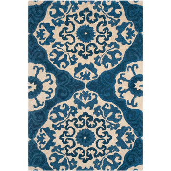 The rug's dimensions are a versatile 4 feet by 6 feet, ideal for smaller spaces or as a distinctive accent piece. The inviting hues of blue and ivory interlace in a symphony of floral and ornamental motifs, creating a stunning pattern that captures both the eye and the imagination. Intricately tufted by skilled artisans, this piece reflects a commitment to craftsmanship and quality.