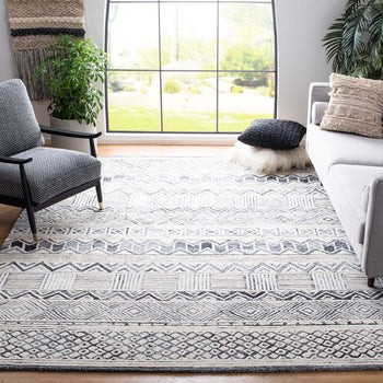 The rug features an eye-catching pattern with a harmonious mix of geometric shapes and tribal motifs, creating a unique visual landscape that speaks to the free-spirited essence of bohemian decor. The bold yet neutral tones ensure this piece will make a statement without overwhelming your space, making it the perfect anchor for your living room, bedroom, or study.