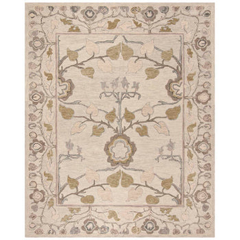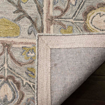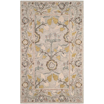 Adorned with a sophisticated light grey and multi-color palette, the rug radiates elegance through its intricate pattern. The design showcases a harmonious blend of botanical motifs, where leaves and floral elements interplay in a graceful dance. The soft grey background provides a serene foundation, allowing the muted yellows and varied grey tones of the embellishments to pop, creating a refined aesthetic that complements a wide range of decors.