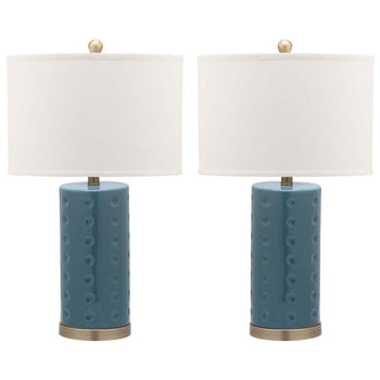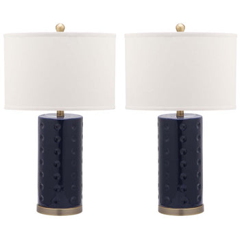 This navy blue Roxanne Table Lamp brings a bold touch of color to contemporary interiors. Its cylindrical ceramic base is adorned with recessed dots and accented with bronze fittings with a contrasting white cotton shades for a visually striking look. Sold in sets of two.