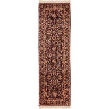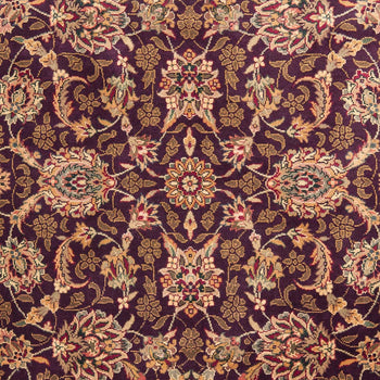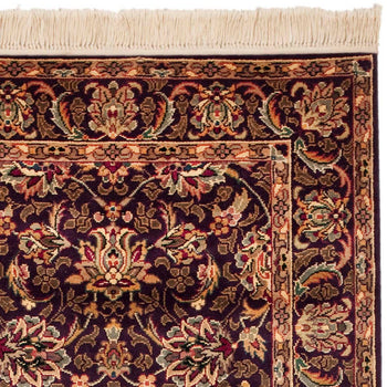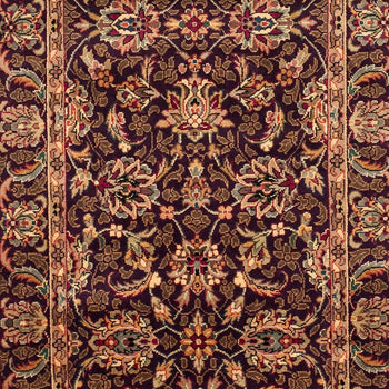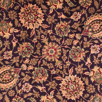 Carefully constructed in China, this rug reflects the country's deep-rooted history in textile mastery. The ornate pattern, blooming with intricate florals and sophisticated border detail, whispers tales of ancient gardens and opulent tapestries. The refined palette harmonizes burgundy, gold, and deep navy tones, creating a visual feast that will elevate the ambiance of your space.