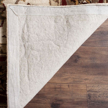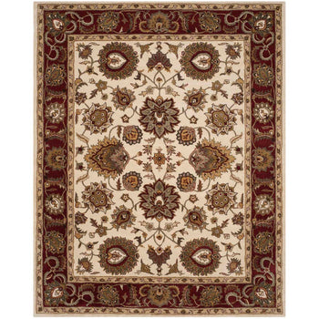 The deep red border encloses the ivory field, highlighting intricate vine scrolls and palmettes, lending a sense of grandeur and elegance to the overall design. This luxurious rug is not just a floor covering but a piece of art that will complement any room, making a bold statement with its rich colors and elaborate patterns.