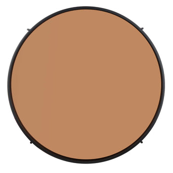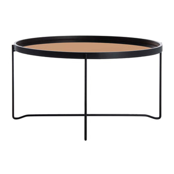 Brilliant color, rich materials and bold form define this contemporary round tray top coffee table. Ideal for any living room, slender black legs elevate the minimalist black wood frame surrounding its versatile rose gold glass tray top.