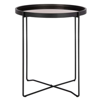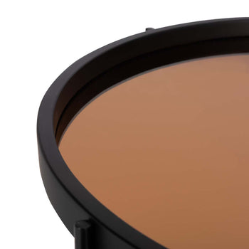 Rich and luxurious, this contemporary small round tray top accent table updates any living room with its fashionable and functional style. Inspired by modern glass artisans, its versatile rose gold glass top is framed by chic black wood and iron legs.