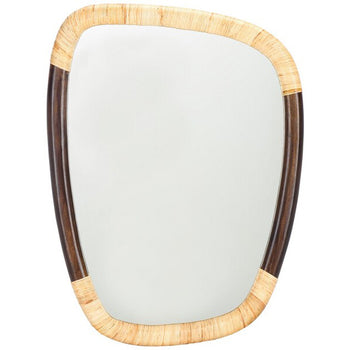 Liven up your decor with our charming and richly textured Rupa mirror. The natural textures and artisanal appeal of our handmade mirror offer inviting drama and elegance. With softly curved edges and an asymmetric shape, the mirror lends organic quality and interest to any corner. Cane is beautifully wrapped around its rounded frame. It creates a stunning contrast with its deep brown Mango wood frame. Offering elevated warmth and style, our mirror adds stunning dimension to your entryway table, console, or mantel. It can amplify natural light and offer the perfect spot for style checks and touch-ups.