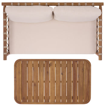 Transform your outdoor space into a stylish retreat with the Sabrina Bench and Table in teak and cream. This elegant pair combines natural wood and soft fabric to create an inviting and comfortable setting for any patio or garden. The warm teak brown finish complements the soothing cream hues, adding a harmonious touch to your outdoor decor. Crafted from wood, fabric, and foam, this set offers a blend of comfort and function, making it perfect for family gatherings, quiet afternoons, or festive celebrations. Whether you are sipping your morning coffee or entertaining guests, the Sabrina Bench and Table invite relaxation and conversation in your outdoor haven. The thoughtfully designed materials ensure that you enjoy this stunning set in any outdoor setting, enhancing the appeal of your open-air lifestyle. Redefine your outdoor experience with the timeless style of Sabrina Bench and Table.
