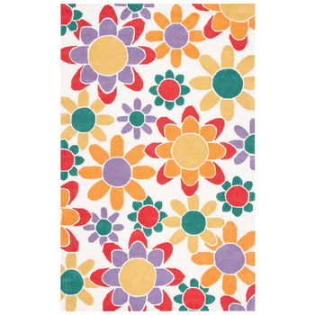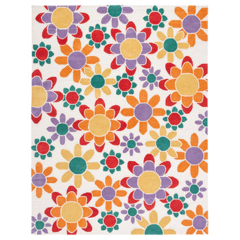 Infuse your living space with a splash of color and a touch of vibrancy with this charming 3' X 5' area rug. Boasting a delightful Ivory/Gold color palette, this small rectangle rug is sure to enrich your room with its warmth and elegance. The rug features a whimsical floral pattern that bursts with an array of rich, bold hues including sunny yellows, deep purples, refreshing greens, and inviting oranges, creating an uplifting atmosphere in any room.