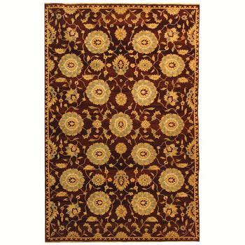 Flourishing with a sophisticated floral pattern, the rug features a rich chocolate brown base interwoven with vibrant hues of golden and soft green florals, creating a warm and inviting atmosphere. The intricate border detail adds a classic finish, making this rug a versatile piece that complements both modern and traditional decor.
