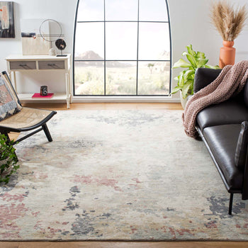 The rug's design features an abstract pattern with splashes of color that evoke a sense of modern artistry. Its unique aesthetic is characterized by a fluid arrangement of soft color transitions, which provides a sense of movement and depth to your floors.