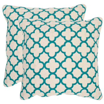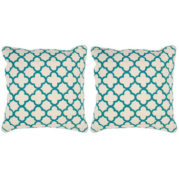 Inspired by Moroccan quatrefoil tiles, the motif of the set of two Sandre accent pillows is fresh and new in a chic teal and white palette. Artfully embellished with wool chain stitch embroidery on front, Sandre pillows come with a solid cotton backing.