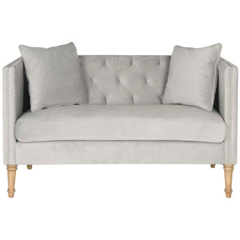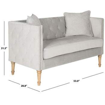A loveseat to love at first sight, the Sarah Tufted Settee is a modern blend of the classic chesterfield and tuxedo sofas. Covered in chic grey velvet with button tufted back and silver nailhead trim, it features two decorator throw pillows. Sophisticated yet cozy, Sarah rests on beautifully turned Louis XVI legs in a weathered oak finish.