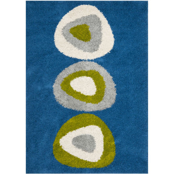 The striking pattern features an abstract array of pebble-like shapes in a harmonious blend of blues, grays, and vivid green accents, creating a dynamic and inviting atmosphere. The mix of cool and warm tones in this design enables it to seamlessly integrate with a wide range of color schemes and decor styles.