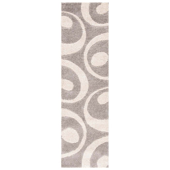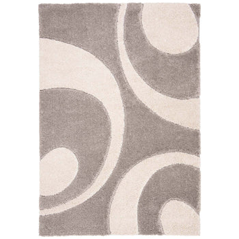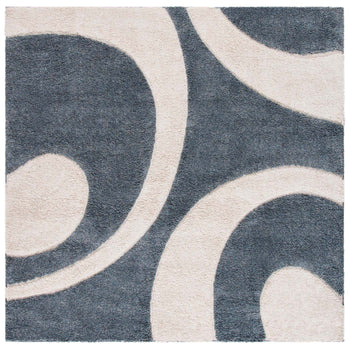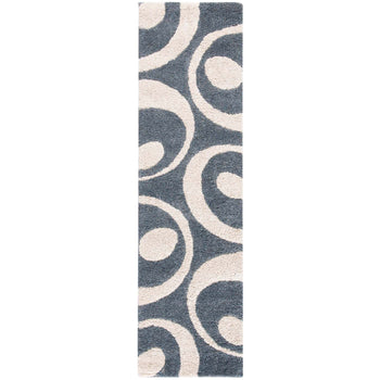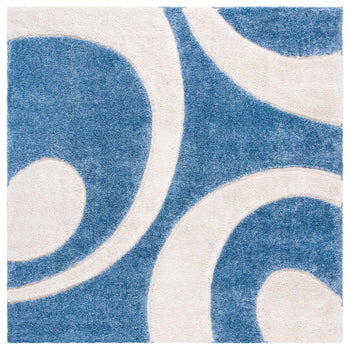 Crafted in Turkey using the latest power-loomed technology, the rug boasts a durable polypropylene pile that is designed to withstand the rigors of daily use while maintaining its luxurious shaggy texture. The design features a striking pattern with swirls and curves in varying shades of blue, set against a soothing ivory background, creating a harmonious and modern look that is versatile enough to complement a wide range of decors.