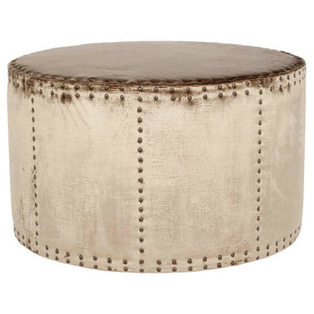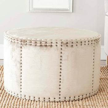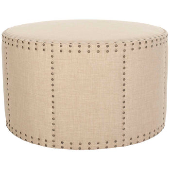 Brass nail head details infuse the round Sherri Ottoman with a hint of tradition. A crisp beige linen blend softens Sherri's more glamorous details, offering a designer smart addition to any room.