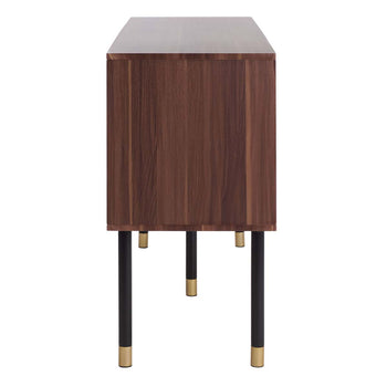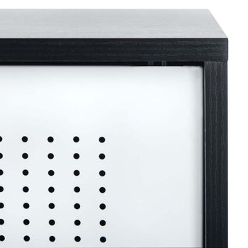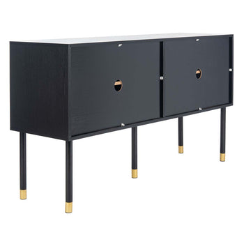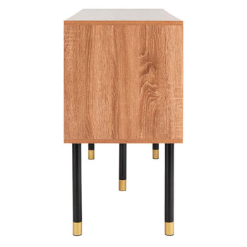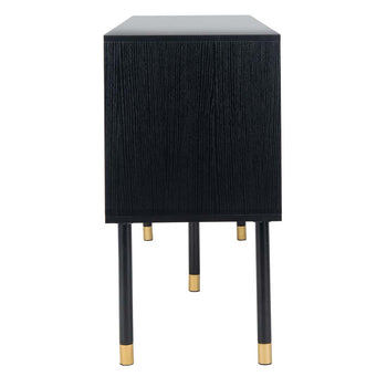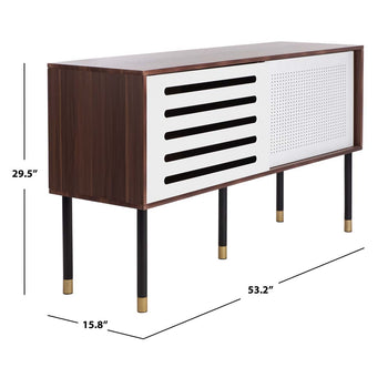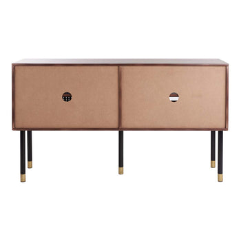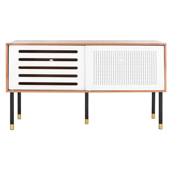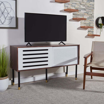 Bring the character and warmth of retro style to any living room with this mod TV stand. Finely crafted in luxurious detail, the beauty of black and white wood design and vintage inspired black metal gold capped legs make it a designer must have.