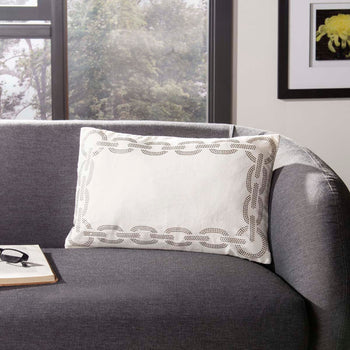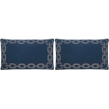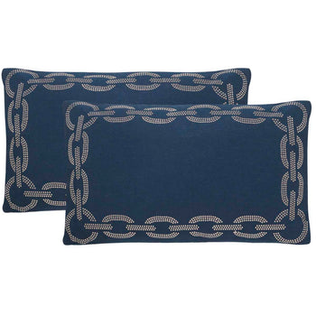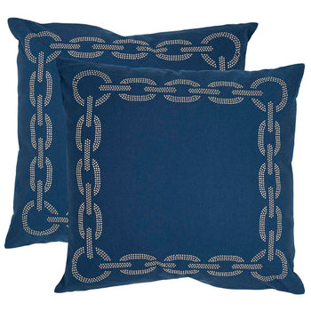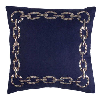 The classic sailor's knot is an elegant adornment, whether it's used for jewelry, porcelain or pillows. Here a navy blue cotton cover is accented with oval chain link embroidered border with circles punctuating each artfully mitered corner.