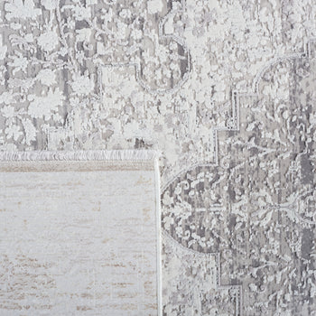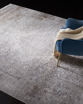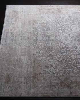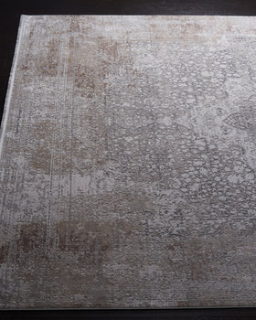 The rug's pattern channels modern elegance, featuring an intricate central medallion amidst a distressed field, embodying a sense of timelessness while embracing contemporary design. Whether anchoring your living room furniture or adding a luxurious feel to your bedroom, this rug promises to make a statement and enhance the overall aesthetic of your interior design.