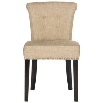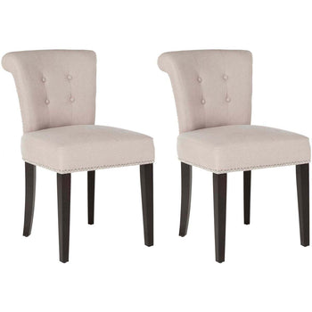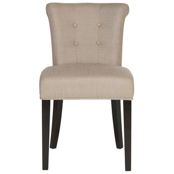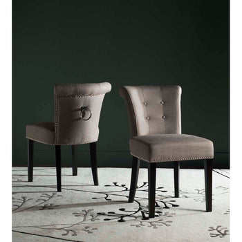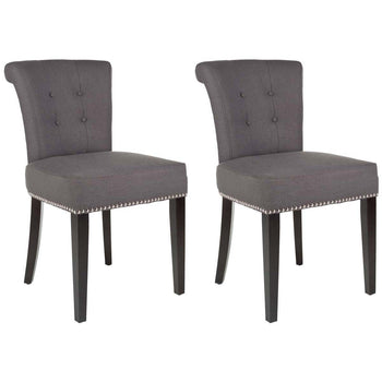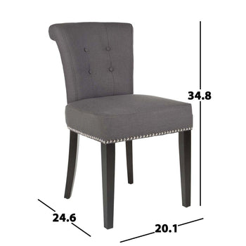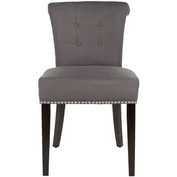 The bent back of the Sinclaire dining chair, in charcoal fabric with espresso finish on the legs, gets a classic dressed up punch thanks to exposed nail heads and cleaver metal ring on its back. Button tufts on the front of the tapered backrest and generous cushions make it a handsome seat.