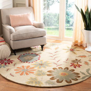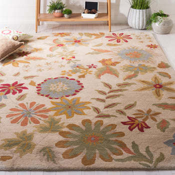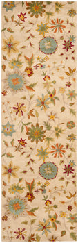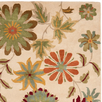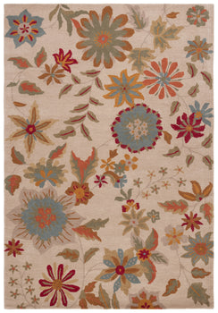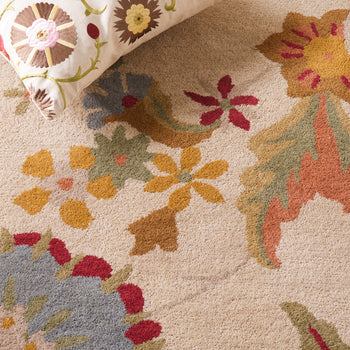 Crafted with the utmost skill in the rich textile heritage of India, this rug showcases a stunning floral pattern brimming with vibrant blooms in a symphony of colors?rustic sage greens, earthy browns, muted blues, and cheerful yellows?perfectly complemented by the plush ivory background. The intricate design captures the beauty of a serene garden, bringing timeless sophistication to your home decor.