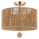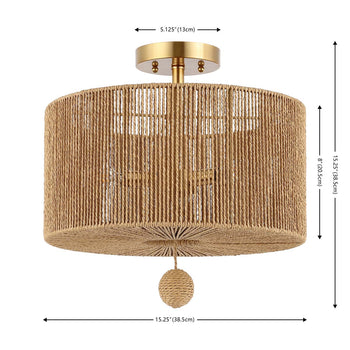 Make a chic statement in any room with our Solmaz flush mount. A modern and elegant drum shade is elevated with clean woven lines to serve as a fresh and charming way to light up your home. Its rich textural appeal is completed with a hanging woven ball to lend bohemian vibes to any space. Accented with gold hardware, our 3-light flush mount illuminates your dining room, kitchen, or bedrooms with a dose of style and warmth.