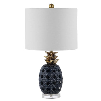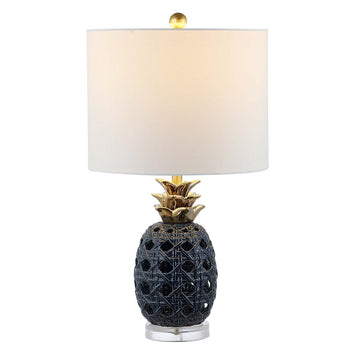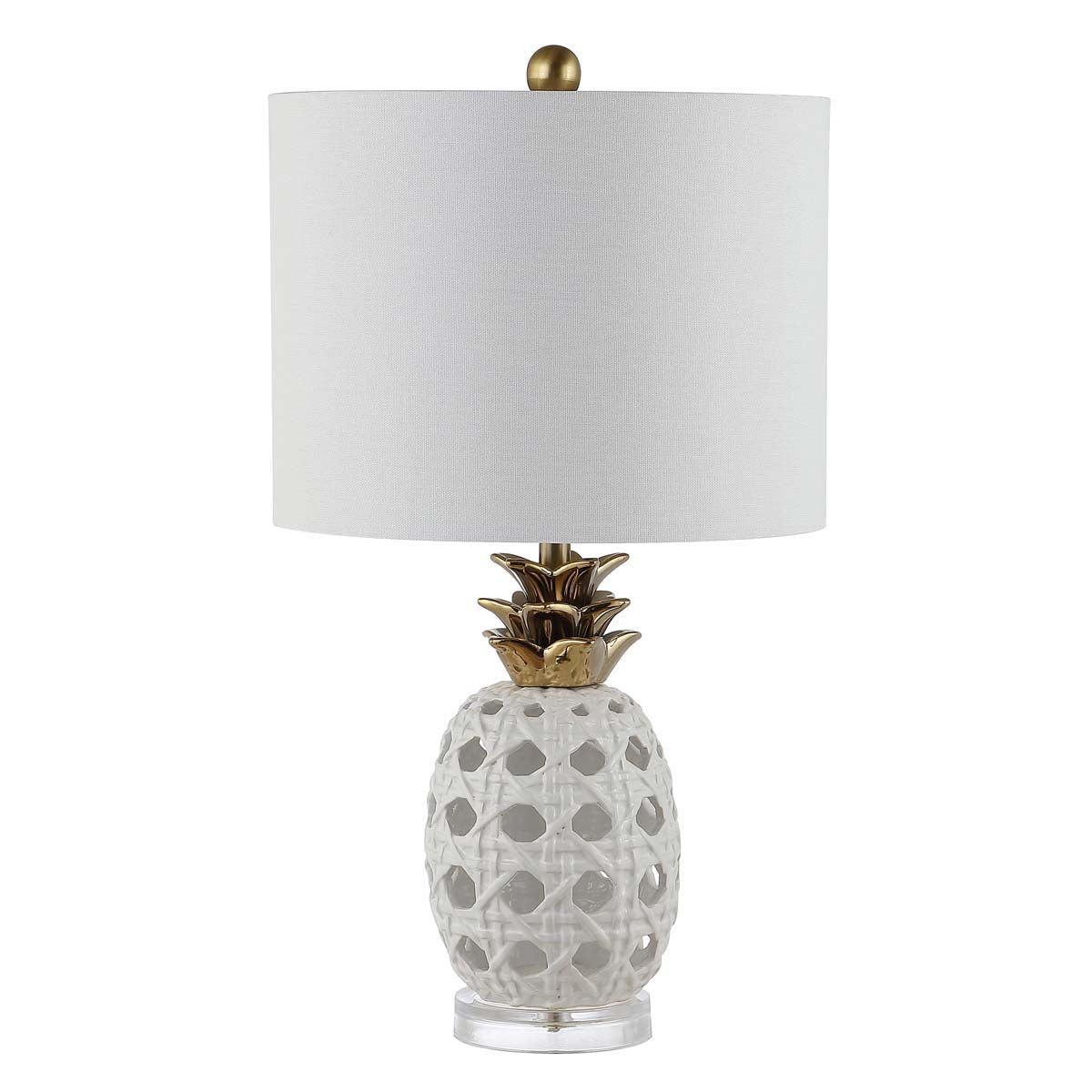 Warm and inviting in its playful aura, this Sonny Table Lamp glows in any contemporary Decor. Sonny's pineapple emblem of hospitality makes it a perfect centerpiece in an entryway, and an open white ceramic lattice body creates a stunning interplay of light and shadow. Gold finished leaves give a glamorous touch.