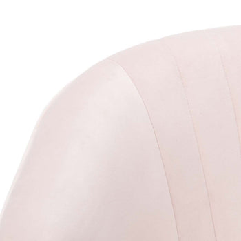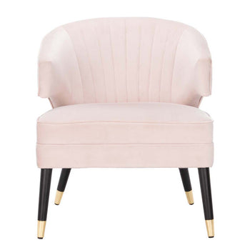 Curl up and unwind in this retro style wingback accent chair. Inspired by vintage designs, its plush pale pink velvet upholstery with luxurious channeling is an instant invitation to relax. The chic caps on its black wood legs completes its retro look.