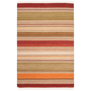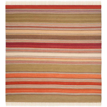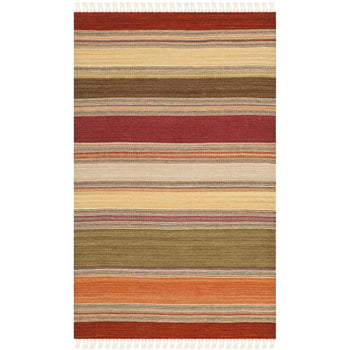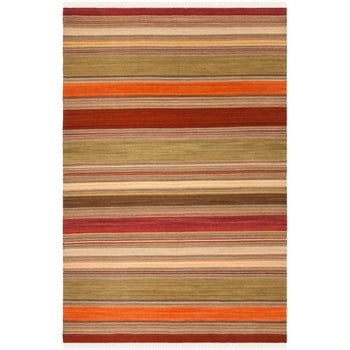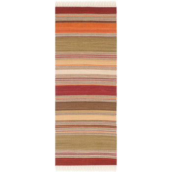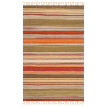 The captivating rug pattern features an earthy palette of greens harmoniously blended with warm reds and neutrals, creating a rich tapestry of color that can complement a wide range of interior designs. Its striped pattern brings a sense of order and elegance, while the subtle variations in hue add depth and character to the piece.