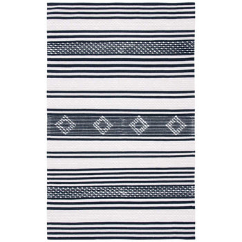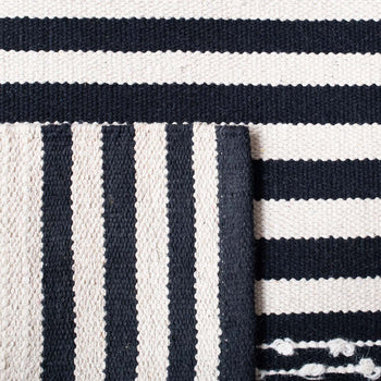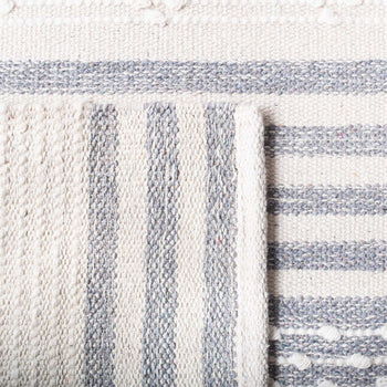 Crafted from a luxurious mix of 90% cotton and 10% wool, the rug showcases a harmonious silver and ivory color palette, promising to complement a wide range of decors. The varied width stripes and diamond-like patterns create a subtle yet captivating design that draws the eye without overwhelming your space.
