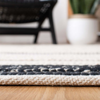 Elevate your living space with this handwoven contemporary square area rug, expertly crafted in India. The rug spans 3 feet by 3 feet, encapsulating the perfect balance of form and function with its 1/4-inch height profile. Constructed from high-quality cotton for durability and softness, the design showcases a sophisticated ivory and black color palette that exudes modern elegance.