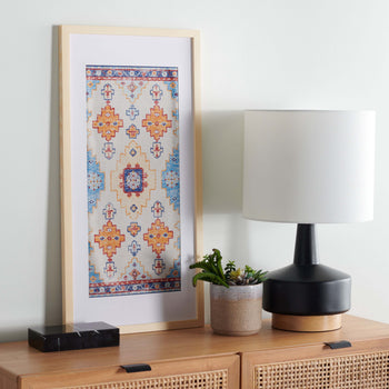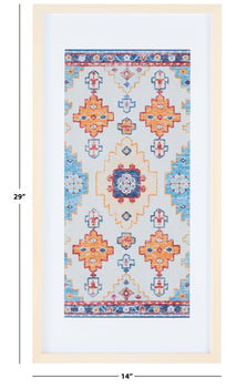 Enliven your walls with the exceptional artistry and energizing colors of our Sumi framed textile wall art. The striking motifs and ornate details of the wall art enrich your home with global aesthetics. The textile is adorned in vibrant shades of blue and orange to add a warm and hearty pop of colors and textures. Encased in a beautiful wooden frame, our textile wall art serves as an artful focal point in any corner of your home.