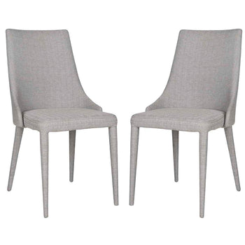 Luxe modern side chairs become ideal dining companions when crafted of easy care upholstery with a sturdy iron frame. This smart set of two combines the sleek style of a deco barrel chair with contemporary lines inspired by London's skyline.