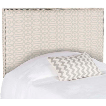 Choose this handsome headboard for the tailored luxury of a luxe cotton and linen blend fabric in wheat and pale blue over thick padding. Offering clean lines for transitional interiors, it is dressed up with a double row of silver nailhead trim.