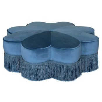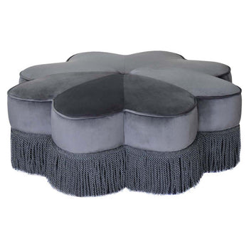 Cosmopolitan loft style made for every day luxury, the Tanith Flower Ottoman flourishes in modern Decor. A dreamy design with heart shaped petals in black velvet and accented with matching fringe and piping, Tanith is ideal for the living room or bedroom as an extra seat, impromptu table, or for soothing tired feet.