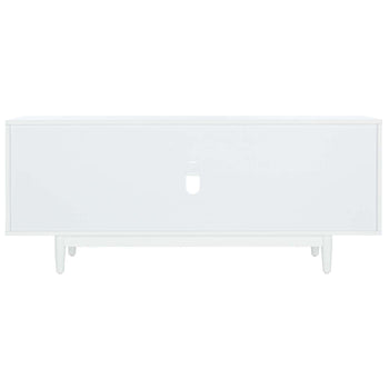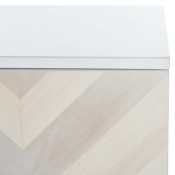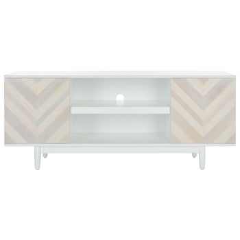 A fabulous throwback to retro-chic sophistication, this Tay Media Stand is absolutely striking. The staggered brown chevron pattern streaming over Tay's two doors brings dramatic visual intrigue to its clean-lined whitewash frame, while its two shelves provide additional storage in busy entertainment areas.
